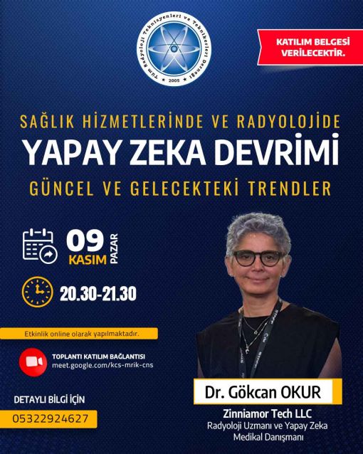 8 Kasım DUNYA RADYOLOJİ GÜNÜ etkinlikleri kapsamında ABD'de Zinniamor Tech LLC göre Radyoloji Uzmanı ve Yapay Zeka uygulamaları üzerine araştırma yapan Dr. Gökcan OKUR uzaktan bağlantı ile '' SAĞLIK HİZMETLERİNDE ve RADYOLOJİDE YAPAY ZEKA'' konulu bir seminer verecektir.