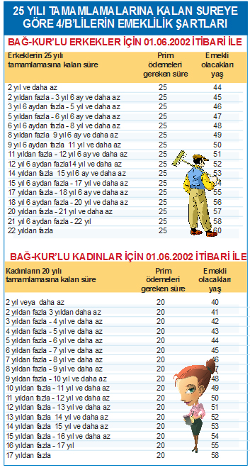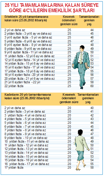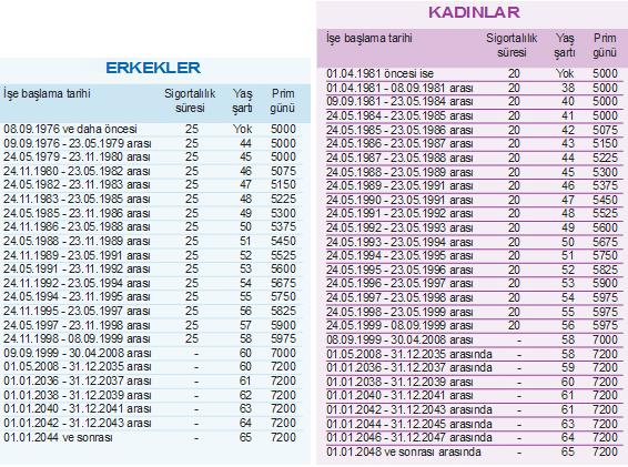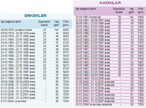 KİM HANGİ ŞARTLA NE ZAMAN EMEKLİ OLACAK ![]() Herkesin çalışma hayatında en çok merak ettiği konu olan emeklilik şartları kaleme alındı. Milliyet'ten Cem Kılıç'ın haberine göre emeklilik hakkına kavuşabilmek için temelde üç şartın yerine getirilmesi gerekiyor. EMEKLİ OLMAK İÇİN GEREKEN 3 ŞARTEmekli olmak için ilk şart belirli bir süre sigortalı olma koşulu. Sigortalılık süresinin yanında belirli bir yaşın da tamamlanması gerekiyor. Emeklilikte üçüncü koşul ise prim ödeme gün sayısı. İşte bu üç koşul bir arada sağlandığında emekli olmaya hak kazanılıyor. Dolayısıyla ne zaman emekli olunacağının hesaplanmasında doğum tarihi ve ilk kez sigortalı olunan tarih büyük önem taşıyor. ESKİ-YENİ SSK'LILARA DİKKATBu 3 koşulun kimlere, nasıl uygulanacağı ise farklılık gösteriyor. Emeklilik şartlarında 4/a'lılar, yani eski adıyla SSK'lılar için çok önemli iki tarih söz konusu: 8 Eylül 1999 ve 30 Nisan 2008. Bu tarihten önce ve sonra sigortalılık giriş tarihleri, emeklilik şartlarında önemli farklılıklar yaratabiliyor. UYARI! RADYASYON ÇALIŞANLARININ EMEKLİLİKLERİ İNTERNETTEN HESAPLAMASGK'nın internetten oluşturduğu uygulama ile de emeklilik yaşını hesaplamak mümkün. http://uyg.sgk.gov.tr/nezaman/ adresindeki bu uygulama ile çalışanlar emeklilik şartlarını detaylı olarak öğrenebiliyorlar. İşte kimlerin hangi şartlarla ne zaman emekli olacağını gösteren o tablolar; İŞE BAŞLAMA TARİHİNE GÖRE 4/A'LILARIN (SSK) EMEKLİLİK ŞARTLARI |