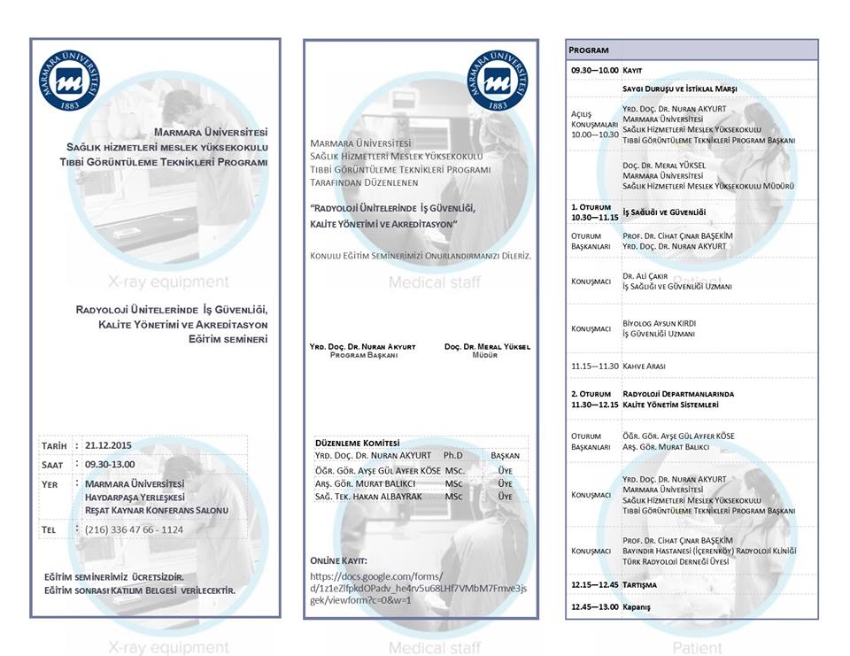 MARMARA ÜNİVERSİTESİNDE RADYOLOJİ ÇALIŞANLARINA YÖNELİK İŞ SAĞLIĞI VE GÜVENLİĞİ SEMİNERİ ![]() Radyoloji Ünitelerinde İş Güvenliği, Kalite Yönetimi ve Akreditasyon Eğitim Semineri Sağlık hizmetlerinde teknoloji kullanımı, alt yapı gelişimi, insan gücü kapasitesi, niteliği ve iyileştirilmesine yönelik yeni yasal düzenlemeler ve standartlar yayınlanmıştır. Sağlıklı ve güvenli bir çalışma ortamının sağlanması yasal gerekliliğin ötesinde çalışanların motivasyonu açısından da önemlidir. Sağlıklı ve güvenli çalışma ortamının sürekliliğinin sağlanması iş performansının yükselmesine ve verimliliğinin artmasına neden olacaktır. Bu açıdan sağlıklı ve güvenli çalışma ortamının oluşturulması, sürdürülmesi ve sürekli iyileştirilmesinin sağlanması tüm sağlık kuruluşları açısından önemlidir. 21 Aralık 2015 tarihinde yapılacak olan Radyoloji Ünitelerinde İş Güvenliği, Kalite Yönetimi ve Akreditasyon Eğitim Semineri eğitimi iki oturumda gerçekleşecektir. Birinci oturumda “Sağlık kuruluşlarında İş Güvenliği ve İşçi Sağlığı konusundaki uygulamalar, yasal mevzuat, sağlık kuruluşlarında çalışanların hukuki hakları ve bu mevzuat/lar hakkında bilgilendirilmesi yapılacaktır. İkinci oturum da Görüntüleme ünitelerinde uygulanan kalite yönetim sistemleri, güvenlik prosedürleri, sağlık işaretleri bu işaretlerin nasıl kullanılacağı konusunda yapılması gerekenler, uygulanmalar ve bunlara yönelik yenilik ve iyi uygulama örneklerine yer verilecektir. Eğitim seminerimize; Radyoloji, Radyoterapi ve Nükleer Tıp ünitelerin de çalışanlar(ünite sorumluları, baş teknikerler, sağlık fizikçileri..) Radyoloji Teknisyenleri, Tıbbi Görüntüleme Teknikleri mezunları(Teknikerler) ve bu ünitelerde staj yapan stajyer öğrenciler katılabilir. Katılım ÜCRETSİZ olup Tüm Katılımcılara KATILIM BELGESİ verilecektir. KAYIT İÇİN TIKLAYINIZ ![]() |