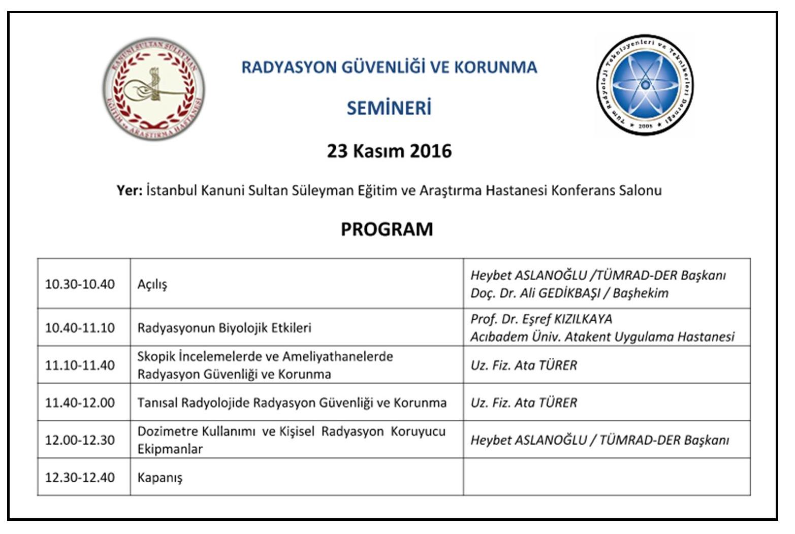 RADYASYON GÜVENLİĞİ VE KORUNMA SEMİNERİ-23 Kasım 2016 Derneğimizin İstanbul Kanuni Eğitim ve Araştırma Hastanesi ile birlikte düzenleyeceği RADYASYON GÜVENLİĞİ ve KORUNMA SEMİNERİ- 23 Kasım 2016 tarihinde Saat 10.00'da İstanbul -Halkalı Kanuni Eğitim ve Araştırma Hastanesi Konferans Salonunda yapılacaktır. Seminere tüm meslektaşlarımız ve Tıbbi Görüntüleme Teknikleri bölümü öğrencilerine açıktır. Katılım ÜCRETSİZ olup, dışardan katılacaklar için kontenjan 100 kişi ile sınırlıdır. Tüm katılımcılara KATILIM BELGESİ verilecektir. Kanuni EAH personeli olmayanların Kayıt Formunu doldurmaları ZORUNLUDUR. İlgilenen meslektaşlarımıza ve öğrencilerimize duyurulur. SEMİNER KAYIT FORMUNU TIKLAYINIZ>>>>> ![]() SEMİNER PROGRAMI ![]() |