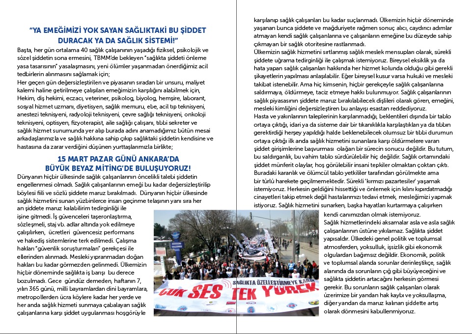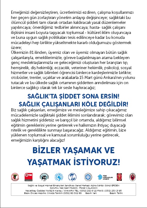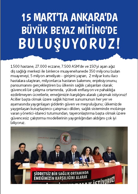 BASIN AÇIKLAMASI 15 MART’TA ANKARA’DA BÜYÜK BEYAZ MİTİNG’DE BULUŞUYORUZ 1.500 hastane, 27.000 eczane, 7.500 ASM’de ve 150’yi aşan ağız diş sağlığı merkezi ile binlerce muayenehanede 350 milyonu bulan muayeneyi, 5 milyon ameliyatı - girişimi yapan, 2 milyar kutu ilacı hastalara ulaştıran, milyonlarca hastanın bakımını, enjeksiyonunu, pansumanını gerçekleştiren bu ülkenin sağlık çalışanları olarak; güvenceli bir çalışma ortamında, yüksek enflasyon ve pahalılığa ezdirilmeyen ücretlerle, emeğimizin karşılığını alarak çalışmak istiyoruz! Aciller başta olmak üzere sağlık hizmet sunumunun her yer ve aşamasında yaygınlaşan şiddetin güven ve meşruluğunu; ülkemizde yaygınlaşan kutuplaştırıcı-çatışmacı dilden, sağlık sisteminde mobinge varan yönetici-idareci tutumundan, taşeronlaştırma başta olmak üzere güvencesiz çalıştırma modellerinin yaygınlığından aldığını çok iyi biliyoruz. “YA EMEĞİMİZİ YOK SAYAN SAĞLIKTAKİ BU ŞİDDET DURACAK Başta, her gün ortalama 40 sağlık çalışanının yaşadığı fiziksel, psikolojik ve sözel şiddetin sona ermesini, TBMM’de bekleyen “sağlıkta şiddeti önleme yasa tasarısının” yasalaşmasını, yeni ölümler yaşanmadan önerdiğimiz acil tedbirlerin alınmasını sağlamak için; Her geçen gün değersizleştirilen ve piyasanın sıradan bir unsuru, maliyet kalemi haline getirilmeye çalışılan emeğimizin karşılığını alabilmek için, Hekim, diş hekimi, eczacı, veteriner, psikolog, biyolog, hemşire, laborant, sosyal hizmet uzmanı, diyetisyen, sağlık memuru, ebe, acil tıp teknisyeni, anestezi teknisyeni, radyoloji teknisyeni, çevre sağlığı teknisyeni, onkoloji teknisyeni, optisyen, fizyoterapist, aile sağlığı çalışanı, tıbbi sekreter ve sağlık hizmet sunumunda yer alıp burada adını anamadığımız bütün mesai arkadaşlarımızla ve sağlık hakkına sahip çıkıp sağlıktaki şiddetin kendisine ve hastasına da zarar verdiğini düşünen yurttaşlarımızla birlikte 15 MART PAZAR GÜNÜ ANKARA’DA BÜYÜK BEYAZ MİTİNG’DE BULUŞUYORUZ! Dünyanın hiçbir ülkesinde sağlık çalışanlarının öncelikli talebi şiddetin engellenmesi olmadı. Sağlık çalışanlarının emeği bu kadar değersizleştirilip böylesi fiili ve sözlü şiddete maruz bırakılmadı. Dünyanın hiçbir ülkesinde sağlık hizmetini sunan yüzbinlerce insan geçinme telaşının yanı sıra her an şiddete maruz kalabilirim tedirginliği ile işine gitmedi. İş güvenceleri taşeronlaştırma, sözleşmeli, staj vb. adlar altında yok edilmeye çalışılırken, ücretleri güvencesiz performans ve hakediş sistemlerine terk edilmedi. Çalışma hakları “güvenlik soruşturmaları” gerekçesi ile ellerinden alınmadı. Mesleki yıpranmadan doğan hakları bu kadar görmezden gelinmedi. Ülkemizin hiçbir döneminde sağlıkta iş barışı bu derece bozulmadı. Gece gündüz demeden, haftanın 7, yılın 365 günü, milli bayramlardan dini bayramlara, metropollerden ücra köylere kadar her yerde ve her anda sağlık hizmeti sunmaya çabalayan sağlık çalışanlarına karşı şiddet uygulanması hoşgörüyle karşılanıp sağlık çalışanları bu kadar suçlanmadı. Ülkemizin hiçbir döneminde yaşanan bunca şiddete ve mağduriyete rağmen sonuç alıcı, caydırıcı adımlar atmayan kendi sağlık çalışanlarına ve çalışanların emeğine bu düzeyde sahip çıkmayan bir sağlık otoritesine rastlanmadı. Ülkemizin sağlık hizmetini sırtlanmış sağlık meslek mensupları olarak, sürekli şiddete uğrama tedirginliği ile çalışmak istemiyoruz. Bireysel eksiklik ya da hata yapan sağlık çalışanları hakkında her hizmet kolunda olduğu gibi gerekli şikayetlerin yapılması anlaşılabilir. Eğer bireysel kusur varsa hukuki ve mesleki takibat istenebilir. Ama hiç kimsenin, hiçbir gerekçeyle sağlık çalışanlarına saldırmaya, öldürmeye, taciz etmeye hakkı bulunmuyor. Sağlık çalışanlarının sağlık piyasasının şiddete maruz bırakılabilecek dişlileri olarak gören, emeğini, mesleki kimliğini değersizleştiren bu anlayışı esastan reddediyoruz. Hasta ve yakınlarının taleplerinin karşılanmadığı, beklentileri dışında bir tablo ortaya çıktığı, idari ya da sisteme dair bir tıkanıklıkla karşılaştıkları ya da tıbbın gerektirdiği herşey yapıldığı halde beklenebilecek olumsuz bir tıbbi durumun ortaya çıktığı ilk anda sağlık hizmetini sunanlara karşı öldürmelere varan şiddet girişimlerine başvurması olağan bir sürecin sonucu değildir. Bu tutum, bu saldırganlık, bu vahim tablo sürdürülebilir hiç değildir. Sağlık ortamındaki şiddet münferit olaylar, hoş görülebilir insani tepkiler olmaktan çoktan çıktı. Buradaki karanlık ve ölümcül tablo yetkililer tarafından görülmekte ama bir türlü harekete geçilmemektedir. Sürekli ‘kırmızı pazartesiler’ yaşamak istemiyoruz. Herkesin geldiğini hissettiği ve önlemek için kılını kıpırdatmadığı cinayetleri takip etmek değil hastalarımızı tedavi etmek, mesleğimizi yapmak istiyoruz. Sağlık hizmetini sunarken, başka hayatları kurtarmaya çalışırken kendi canımızdan olmak istemiyoruz. Sağlık hizmetlerindeki aksamalar asla ve asla sağlık çalışanlarının üstüne yıkılamaz. Sağlıkta şiddet yapısaldır. Ülkedeki genel politik ve toplumsal atmosferden, yoksulluk, işsizlik gibi ekonomik olgulardan bağımsız değildir. Ekonomik, politik ve toplumsal alanda sorunlar derinleştikçe, sağlık alanında da sorunların çığ gibi büyüyeceğini ve sağlıkta şiddetin artacağını herkesin görmesi gerekir. Bu sorunların sağlık çalışanları olarak üzerimize bir yandan hak kaybı ve yoksullaşma, diğer yandan da maruz kalınan şiddette artış olarak dönmesini kabullenmiyoruz. Emeğimizi değersizleşt
