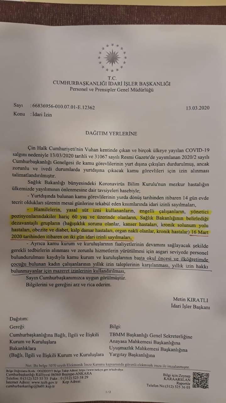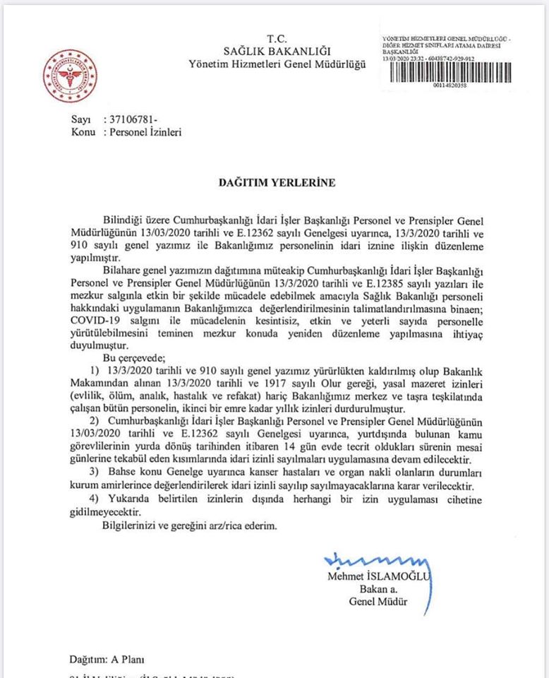 COVİD-19 ÖNLEMLERİ KAPSAMINDA SAĞLIK BAKANLIĞI TÜM İZİNLERİ DURDURDU. ![]() Cumhurbaşkanlığı İdari İşler Başkanlığı Personel ve Prensipler Genel Müdürlüğünün Covid-19 virüsüne dair alınacak önlemler kapsamında 13.03.2020 tarih ve E.12362 sayılı genelgesi ile kamuda çalışanların idari iznine ilişkin düzenleme yapılmıştır. Yayınlanan genelge göre; Hamileler, yasal süt izni kullananlar, engelli olarak istihdam edilenler, yönetici pozisyonda istihdam edileler hariç olmak 60 yaş ve üzerinde olanlar, dezavantaj!' grupta bulunanlar (bağışıklık sorunu olanlar, kanser hastaları, kronik solunum yolu hastaları, obezite ve diabet, kalp damar hastaları, organ naklı olanlar, kronik hastalar) 16 Mart 2020 tarihinden itibaren 12 gün idari izinli sayılmışlardır. Ancak Cumhurbaşkanlığı İdari İşler Başkanlığı Personel ve Prensipler Genel Müdürlüğü tarafından sağlık çalışanları ile ilgili düzenlemenin Sağlık Bakanlığı tarafından değerlendirileceğini bildirmesinin ardından Bakanlığınız tarafından 13.03.2020 tarih ve 114820358 barkod numaralı yazınız ile Sağlık personelinin izinlerinin yasal mazeret izinleri (evlilik, ölüm, analık, hastalık ve refakat ) hariç ikinci bir emre kadar durdurulduğu; kanser hastaları ve organ nakli olanların durumlarının kurum amirlerince değerlendirilerek izinli sayılıp sayılmayacaklarına karar verileceği yazınızın 4.cü maddesinde de bu izinlerin dışında herhangi bir izin uygulaması cihetine gidilemiyeceği belirtilmiştir. |