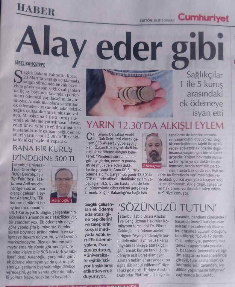 SAĞLIKÇILAR 1 KURUŞ EK ÖDEMEYE TEPKİLİ ![]() Alay eder gibi: Sağlıkçılar 1 ile 5 kuruş arasındaki ek ödemeye isyan etti Sağlık Bakanı Fahrettin Koca, salgın sürecinde büyük özveriyle görev yapan sağlık çalışanlarına üç ay boyunca tavandan performans ödemesi yapılacağını duyurmuştu. Ancak maaşlara yansıtılan ek ödemeler arasındaki adaletsizlik sağlık çalışanlarının tepkisine yol açtı. Sağlık Bakanı Fahrettin Koca, 23 Mart’ta yaptığı açıklamada, salgın sürecinde büyük özveriyle görev yapan sağlık çalışanlarına üç ay boyunca tavandan performans ödemesi yapılacağını duyurmuştu. Ancak maaşlara yansıtılan ek ödemeler arasındaki adaletsizlik sağlık çalışanlarının tepkisine yol açtı. Maaşlarına 1 ile 5 kuruş arasında ek ödeme yatırılmasına isyan eden üniversite ve eğitim araştırma hastanelerinde çalışan sağlık emekçileri yarın saat 12.30’da “Bir dakikalık alkış” eylemi yapacak. BANA BİR KURUŞ İZİNDEKİNE 500 TLİstanbul Üniversitesi-Cerrahpaşa (İÜC) Cerrahpaşa Tıp Fakültesi Hastanesi Acil servis röntgen sorumlusu olarak çalışan Heybet Aslanoğlu, “Ek ödeme dedikleri bu ay benim maaşıma 00.1 kuruş yattı. Sağlık çalışanlarının ödemeleri arasında adaletsizlikler var, bir standart yok. Ek ödemenin neye göre yapıldığını bilmiyoruz. Pandemi süresi boyunca acilde çalıştım ve çalışmaya devam ediyorum, yani kovidin merkezindeyim. Bize ek ödeme yatmıyor ama hiç Kovid görmemiş, izinde olan kişiye bile 500 lira fark yatabiliyor” dedi. Aslanoğlu, çarşamba günü ek ödeme alamayan ya da çok düşük alan çalışanların başhekimliğe dilekçe vereceğini, gelen yanıta göre de hukuki yollara başvuracaklarını kaydetti. YARIN 12.30’DA ALKIŞLI EYLEMCTF Göğüs Cerrahisi Anabilim Dalı Sekreteri olarak çalışan SES Aksaray Şube Eşbaşkanı Özkan Gökbayrak da 5 kuruşluk ek ödeme aldığını belirterek “Pandemi sürecinde her gün işe gittim, odamızı pandemi ile mücadele eden doktorlar ile paylaştık. Ama 00.5 liralık ödeme aldım. Çarşamba günü 12.30’da CTF önünde alkışlı 1 dakikalık eylem yapacağız. SES, bütün hastanelerde kendi bünyesinde alkış eylemi gerçekleştirecek. Sağlık Bakanlığı’na bağlı hastanelerde de benzer sorunların yaşandığını duyuyoruz. Sağlık emekçilerinin talebi üç ay sürecek adaletsiz ek ödeme değil, insanca yaşam için temel ücret artışıdır. Yoğun bakımda yalnızca hemşire ya da doktorlar çalışmıyor, orada temizlik personeli, hasta bakıcı da var. Eşit şekilde bu ücretlerin verilmesinden yana olduk çünkü aynı yükü taşıyan sağlık çalışanlarıyız. Alkış değil, çalışanların haklarının verilmesini talep ediyoruz” diye konuştu. ‘SÖZÜNÜZÜ TUTUN’İstanbul Tabip Odası Asistan ve Genç Uzman Hekimler Komisyonu temsilcisi Dr. Fikret Çalıkoğlu, ek ödeme adeletsizliğine “Aynı pandemiyle mücadele eden, aynı virüse karşı hayatını tehlikeye atarak çalışan, ancak kurum farklılığı nedeniyle eşit ücret alamayan asistan hekimler arasındaki bu eşitsizlik kabul edilemez” diye tepki gösterdi. Türkiye Asistan Doktorlar Platformu ise açıklamasında, pandemi sürecindeki başarıda önemli katkıları olan asistan hekimlerin ek ödemeleri arasında uçurum olduğunu belirtilerek “Covid-19 pandemisi nedeniyle, pandemi hastanesi kapsamında yer alan 3. basamak üniversite ve eğitim araştırma hastanelerinde görevli, tüm asistanların ek ödemelerinin tavandan, ivedilikle yapılmasını istiyoruz” çağrısında bulunuldu. Sağlık çalışanları ek ödeme adaletsizliğine tepkilerini ve taleplerini sosyal medyada açtıkları #Eködemeyalanı, #sözünüzütutun, #üniversitelereşitlikistiyor başlıklarını etiketleyerek duyuruyor. |