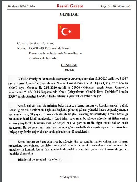 CUMHUR BAŞKANLIĞI ve İÇİŞLERİ BAKANLIĞI'NDAN PANDEMİ İLE İLGİLİ SON GENELGELER ![]() İçişleri Bakanlığı, lokanta, restoran, kafe gibi iş yerleri ile park, piknik alanları, mesire yerleri ve giyim pazarlarıyla ilgili genelge yayımladı. İçişleri Bakanlığı genelgesiyle park, bahçe, piknik alanları, mesire yerleri, plajlar 1 Haziran'dan itibaren kullanılabilecek. Bakanlık, "lokanta, restoran kafe gibi işyerleri, park, piknik, alanları, mesire yerleri ve giyim pazarları" hakkında 81 il valiliğine genelge gönderdi. Genelgede, yeni tip koronavirüs (Kovid-19) salgınının görüldüğü andan itibaren, Sağlık Bakanlığı ve Bilim Kurulunun önerileri Cumhurbaşkanı Recep Tayyip Erdoğan'ın talimatları doğrultusunda, salgının toplum sağlığı ve kamu düzeni açısından oluşturduğu riski yönetme, izolasyonu temin etme, mesafeyi koruma ve yayılım hızını kontrol altında tutma amacıyla birçok tedbir kararı alındığı belirtildi. Genelgede, gelinen aşamada virüsün yayılma ve bulaşma hızının azalması, vaka artış hızının düşüşe geçmesi yönünde kaydedilen olumlu gelişmeler doğrultusunda kontrollü normalleşme sürecine geçildiği ifade edildi. Cumhurbaşkanı Erdoğan başkanlığında 28 Mayıs'ta toplanan Cumhurbaşkanlığı Kabinesinde Bilim Kurulunun önerileri doğrultusunda daha önce genelgelerle getirilen yasaklama/kısıtlamaların bazılarının kaldırılması konularının değerlendirildiği bildirildi. Kronik hastalığı olanlar ile hamileleri ilgilendiren idari izinlerle ilgili alınan kararları da açıklayan Cumhurbaşkanı Erdoğan, "Sağlık Bakanlığı tarafından tanımlanan ve takibi yapılan kronik hastalığı olan kamu personelinin durumları, kurumlarınca değerlendirilecek." diye açıklama yapmıştı. Buna göre, hamileler ve kronik hastaların idari izinlerinin devam edip etmemesi de çalıştıkları kurum ve kuruşlarına inisiyatifine bırakılmıştı. Şimdi bu kararla ilgili bir genelge yayımlandı. Yayınlanan Cumhurbaşkanlığı genelgesine göre Sağlık Bakanlığının belirlediği kronik hastalar idari izinli sayılacak. İdari izinde olan, bu sürede görevlerini yerine getirmiş sayılacak. |