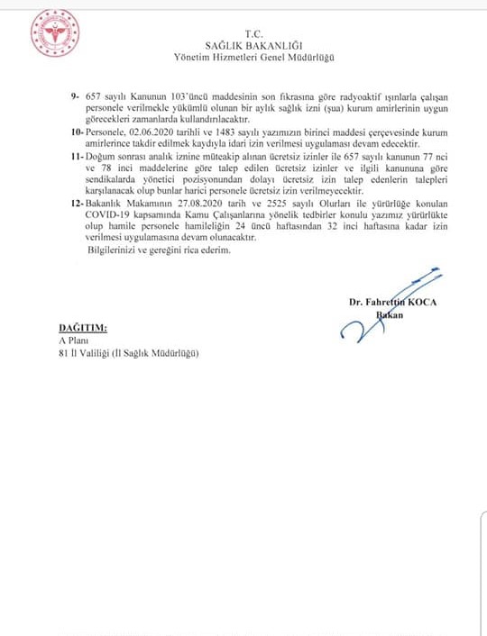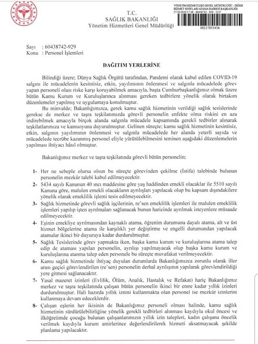 SAĞLIK BAKANLIĞI : İZİNLER 2.Cİ DUYURUYA KADAR İPTAL ![]() Sağlık Bakanlığı: Sağlık personelinin izinleri durduruldu, istifaları kabul edilmeyecekSağlık Bakanlığı 81 ile genelge gönderdi. Sağlık Bakanlığının gönderdiği genelgeye göre bu süreçte istifa talepleri kabul edilmeyecek ve ikinci bir emre kadar ŞUA İZİNLERİ , Evlilik, Ölüm, Analık, Hastalık ve Refakat izinleri HARİÇ sağlıkçıların tüm izinleri iptal edildi.