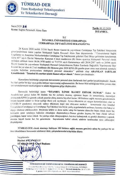 CERRAHPAŞA'NIN PERSONEL İLANI İLE İLGİLİ İTİRAZ BAŞVURUSU YAPTIK. ![]() İSTANBUL ÜNİVERSİTESİ-CERRAHPAŞA CERRAHPAŞA TIP FAKÜLTESİ DEKANLIĞI’NA 26 Kasım 2020 tarihli 31316 Sayılı Resmi Gazete’de yayımlanan Cerrahpaşa Tıp Fakültesi bünyesinde görevlendirilmek üzere yapılan Sözleşmeli Sağlık Personeli Alımı İlanı duyurusunda ARANILAN ŞARTLAR 6.maddesinde ‘’İstanbul ili sınırları içinde ikamet ediyor olmak.’’ ibaresi yer aldığı için itirazda bulunduk. Kanunların belirlediği çerçevede üniversiteler personel alım ilanlarında özel şartlar koyabilmektedir. Ancak bu özel şartlar bir kişi veya gruba imtiyaz veya avantaj sağlamamalıdır. Bu husus ihlal edildiğinde bilim yuvası olan üniversitelerimizin tarafsızlığına ve adalet duygusuna gölge düşürecektir. İlanınızda belirtildiği üzere ‘’İSTANBUL İLİNDE İKAMET EDİYOR OLMAK’’ ifadesi ile Anadolu’nun geriye kalan 80 ilindeki bin bir zorlukla okumuş, eğitimini başarı ile tamamlamış, mezuniyet sonrasında KPSS’ye girerek yüksek puanlar almış atanma hayalleri kuran 100 binlerce sağlık mezunu gençlerimizin önünü keserek adalet ve fırsat eşitliği ilkesi yok sayılmıştır. diyerek TÜMRAD-DER olarak atanmayı bekleyen 100 binlerce sağlık mezunu gencimiz adına bu yanlışın bir an önce düzeltilmesi hususunda talebimizi ilettik. ![]() |